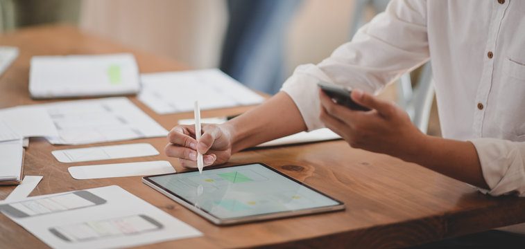 Cropped shot of youngl ux web developer working on her project while using digital tablet
