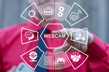 Woman looking and speaking through the webcam while making a video conference with laptop.
