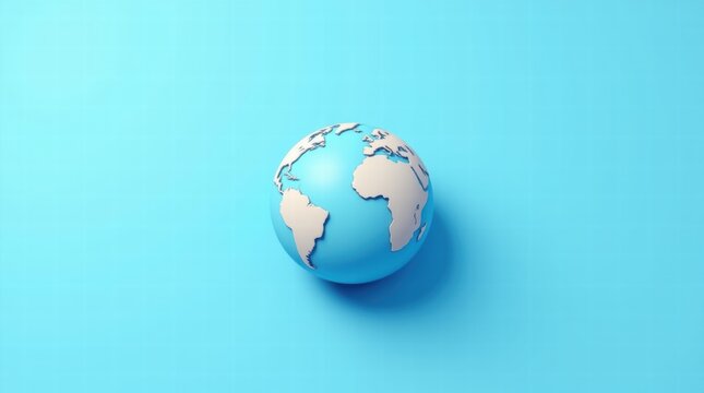 A minimalist earth globe with a shopping cart overlay, symbolizing global e-commerce, on a solid light blue background