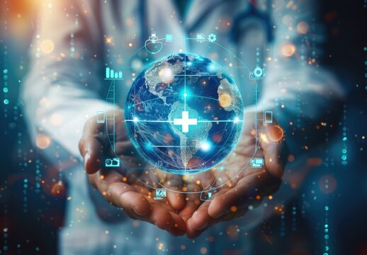 A digital futuristic and technological approach to global healthcare. doctor holding a holographic globe. Surrounding the globe are various icons and symbols related to health and medicine.