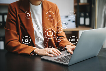 Businesswoman hand using laptop, tablet and smartphone  in office. Digital marketing media mobile app in virtual icon