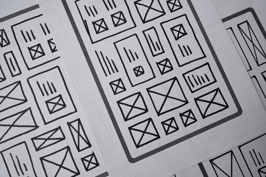 UX website design wireframe. Sketch, prototype, framework, layout future design project. UI/UX - user interface, user experience designer. Creative concept for web design studio. Website development