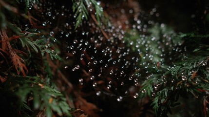 Dew-covered spiderweb glistening like delicate jewels on evergreen branches