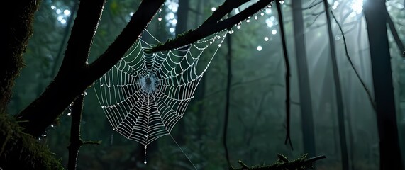 Delicate spider web droplets shimmering like glittering jewels hanging between spiderweb branches in forest