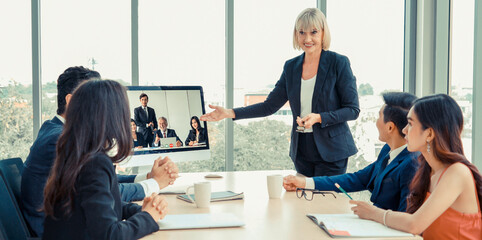 Video call group business people meeting on virtual workplace or remote office. Telework conference call using smart video technology to communicate colleague in professional corporate business.