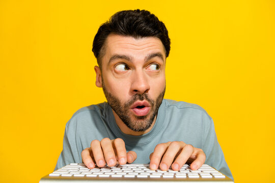 Closeup photo of young blogger programmer online learning look empty space guide how code works keyboard typing isolated on yellow color background