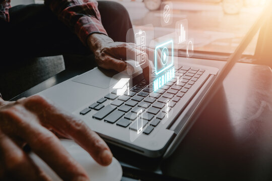 Webinar e-learning training business internet technology concept. Person hand using laptop computer and smart phone with VR screen webinar icon on office desk.