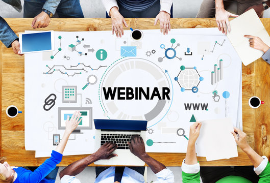 top view of person using laptop computer with text WEBINAR and JOIN NOW on grey desk, e-learning concept