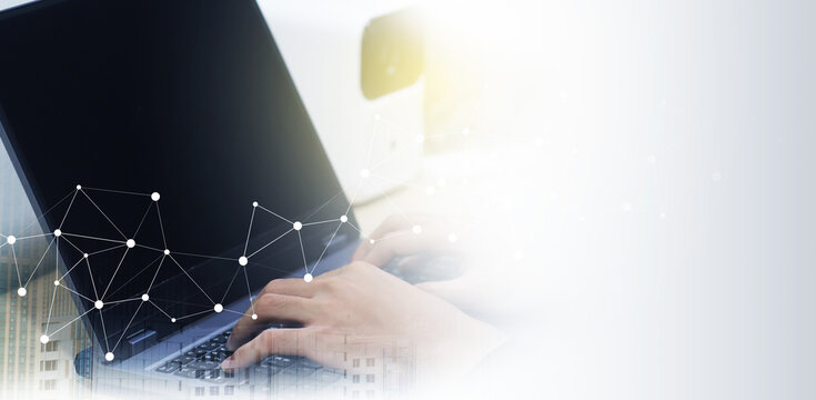 Digital technology, internet network connection, big data, digital marketing IOT internet of things. Man using laptop computer surfing internet, innovative technology.