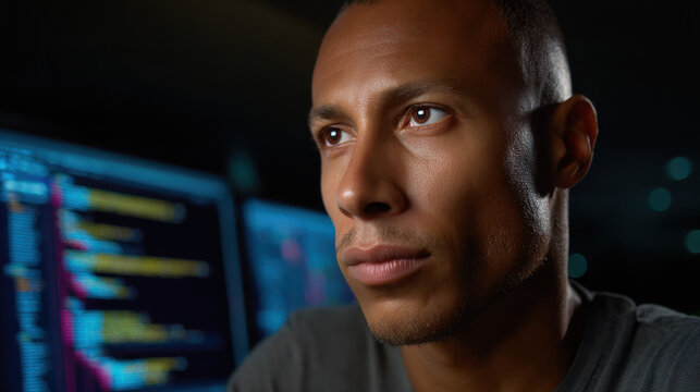 Focused Male Programmer Analyzing Code on Multiple Monitors in a Dark Office Environment