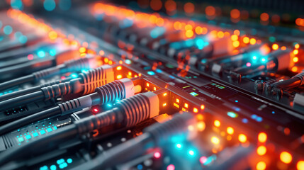 Closeup reliable website hosting provider, server cabinet room interior, copy space. Server room background with buttons and wires.