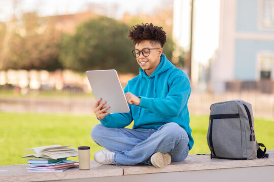 Brazilian college student guy websurfing on digital tablet sitting outdoor