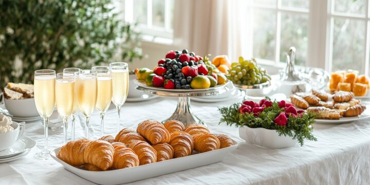 A New Year Day brunch spread featuring mimosas, croissants, and fresh fruit on a white tablecloth,space for text