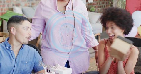 Diverse mother presenting birthday cake with informal celebratory atmosphere