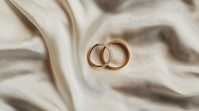 Wedding invitation card template. Top view blank paper card, ribbon, golden rings, flowers on white background.