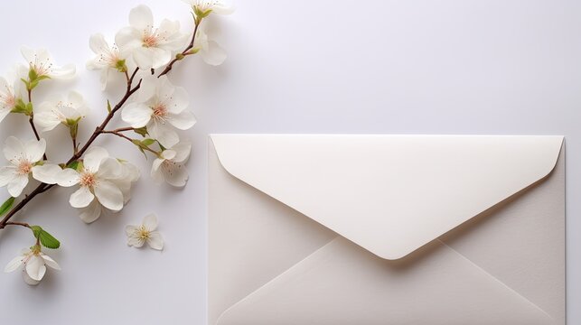 Blank Card with Flowers on White Background. Flower, Blooming, Floral, Invitation, Celebration, Marriage, Flatlay, Top View, Love, Template, Greeting, Romantic, Frame, Invite