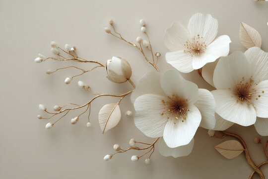 Creamy white paper flowers and gold stems on beige background, creating elegant and minimalist design, ideal for wedding or spring themes, showcasing free space