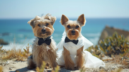 Two cute dogs in wedding attire, posing on a sandy beach with the ocean in the background. Perfect for themes related to pets, weddings, and outdoors.