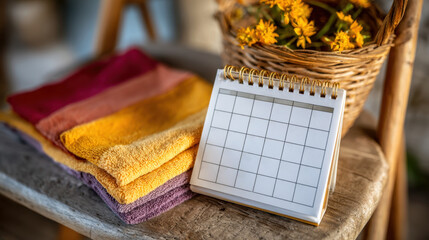 Sticky notes and calendar wall planner with colorful towels and basket of flowers for organized workspace