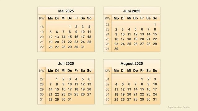 German 2025 quarterly calendar showing months May to August with week numbers, beige background, simple layout for planning and organization
