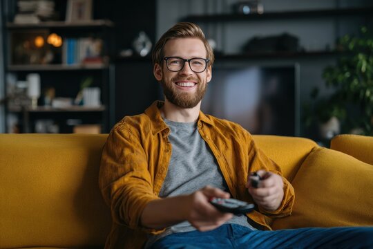 Leisure activities on the weekend Young Caucasian man with a remote changing TV channels at home enjoying a captivating show indoors