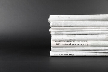 Stack of newspapers, coffee, pen and glasses on wooden table, closeup