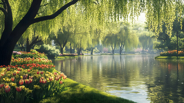 Serene Spring Landscape: Weeping Willows and Tulips by the Lake