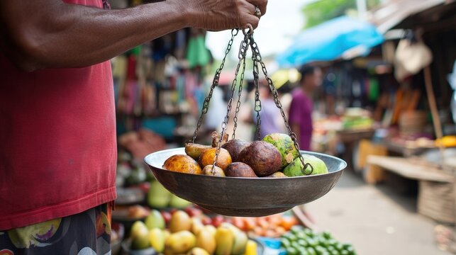Market vendors weighing goods in vibrant outdoor setting
