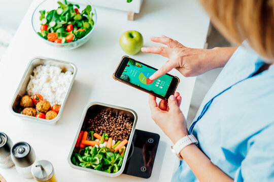 Top view of girl holding smartphone while weighing banana on kitchen table, calorie counting diet