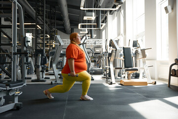 Fitness woman doing lunges exercises for leg muscle workout in gym. Active girl doing front forward one leg step lunge