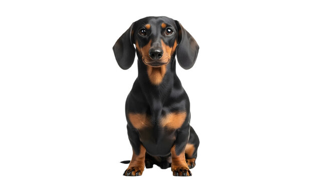 A dachshund dog sitting and looking at the camera on transparent background