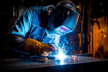skilled welder focuses intently on a metalwork project, creating bright sparks in a dimly lit workshop. orange glow of the sparks contrasts with the welders protective gear