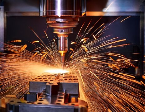 Industrial machine uses advanced tech to cut metal sheet. Sparks fly during precise metalworking process. Modern factory environment displays manufacturing. Automated equipment, tech details