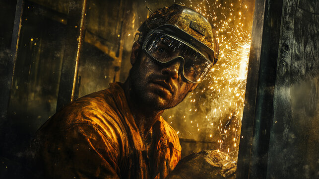 Skilled welder intently focused on metalwork task in the industrial setting of a shipbuilding workshop surrounded by a glowing bokeh effect on a dark backdrop that highlights the captivating scene