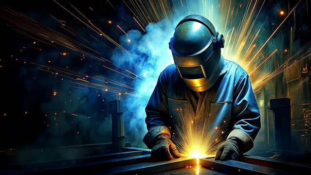 Industrial welder at work with sparks and protective gear