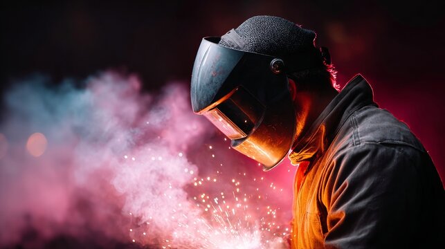 Welder working with sparks in a workshop, wearing protective gear against a dramatic illuminated background