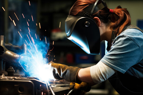 Woman in welding helmet working on piece of metal in workshop, sparks flying around - Female welder, workplace gender equality. Generative AI