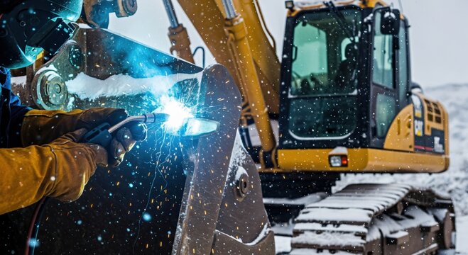 Skilled worker welding heavy excavator bucket in snowy winter conditions outdoors