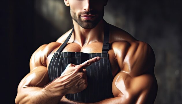 A muscular man with a beard, wearing a chef's apron, points to his well-defined arm muscles, highlighting strength and fitness