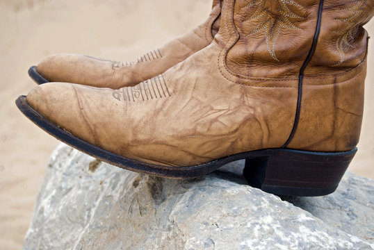 Vintage cowboy hat and a pair of worn leather boots standing on a wooden floor