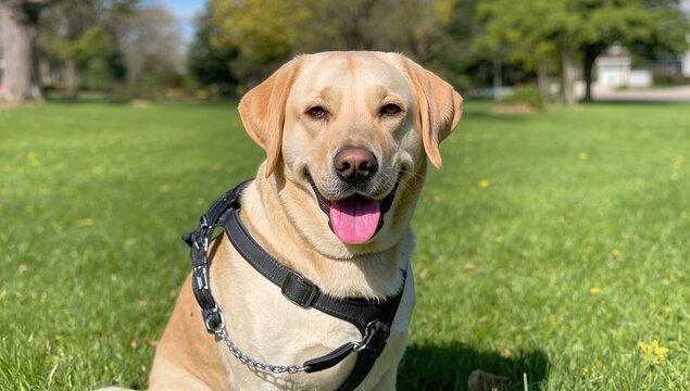 Two-year-old Labrador Retriever serving as a guide dog in a green park
