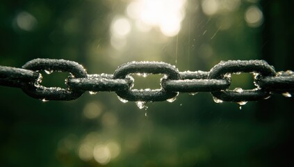 A close-up of a wet chain with water drops and blurred background