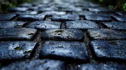 Shimmering wet cobblestone alley leading through historic narrow street to distant light