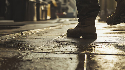 Walking solitary figure on wet downtown avenue at dusk with golden streetlight reflections