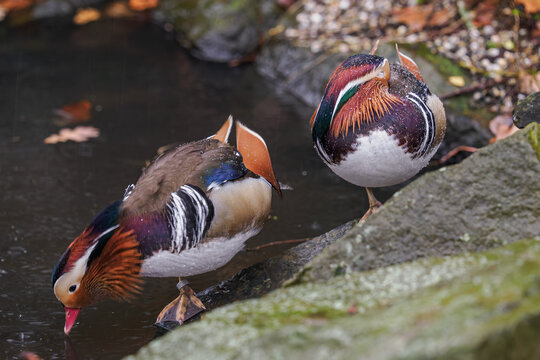 A small bird, wet from bathing in shallow water, is captured in a close-up shot. Another bird is in the background, with droplets of water