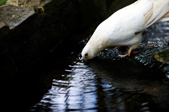A white pigeon lowers its head to drink from a dark, rippling pool. The sharp contrast between the bright feathers and the shadowed water highlights a quiet, peaceful moment of survival in nature.