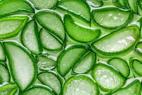 Aloe Vera closeup.aloe vera slice top view texture background. Aloevera plant, natural organic renewal cosmetics, alternative medicine.Aloe leaf slices with drops