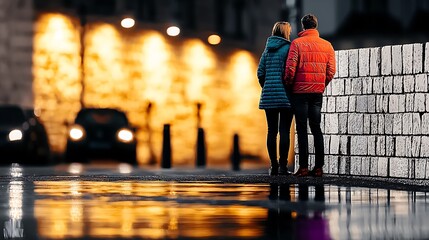 Couple in colorful jackets standing by a wet stone wall at night with glowing street lights