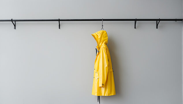 Yellow waterproof raincoat hanging on rack against grey wall, rainy weather fashion, protection and clothing concept, minimalism.