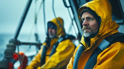 Two men in yellow rain jackets on a boat looking out into the distance possibly during a storm or rough seas.